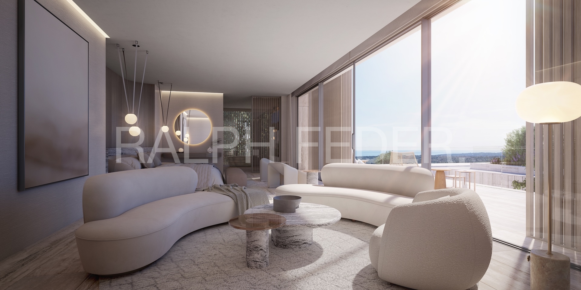Both the upper level and the main floor open directly onto expansive outdoor terraces, thoughtfully designed with numerous relaxation areas from which to enjoy the breathtaking views of the sea and the surrounding golf courses.