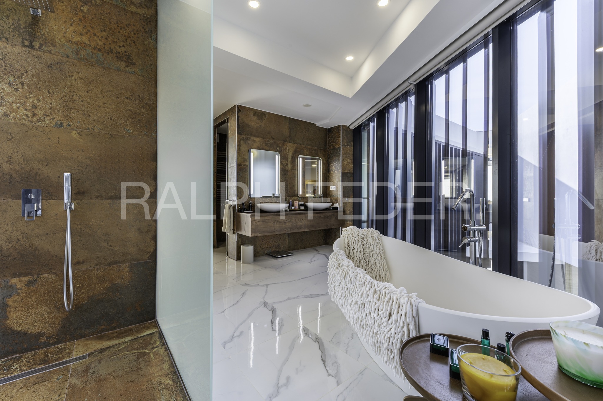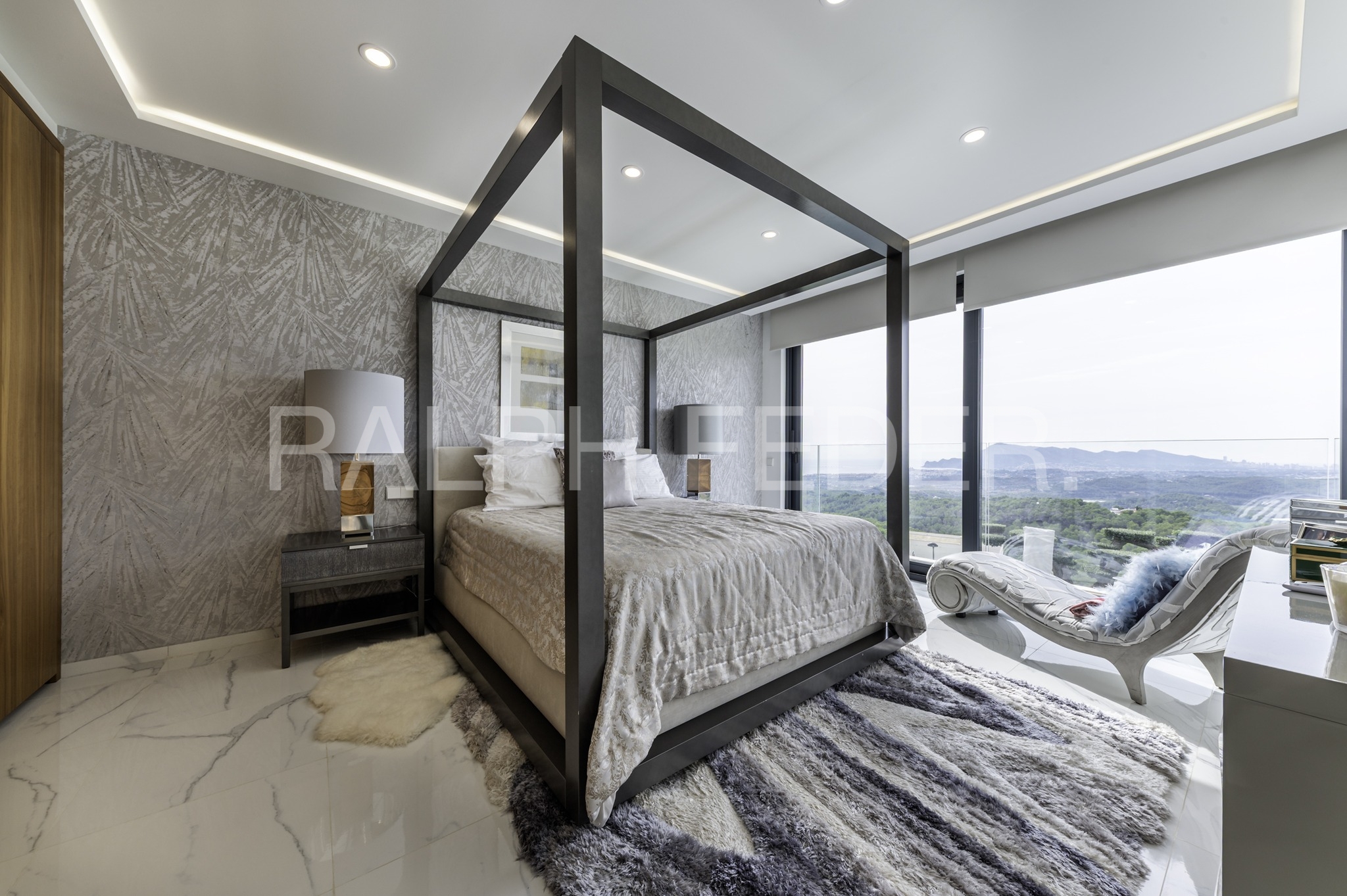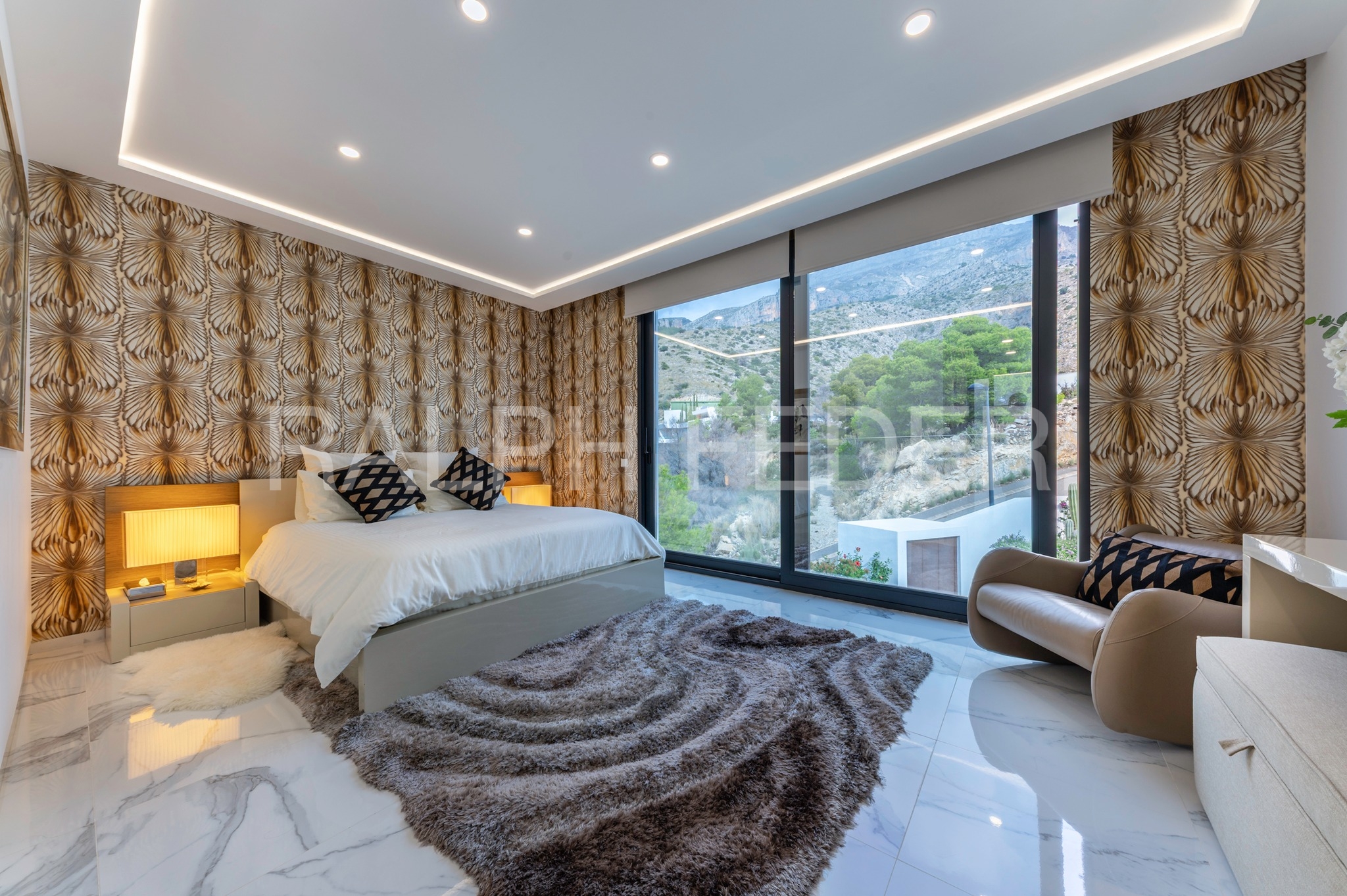 The upper floor integrates the master bedroom en suite with living room and fireplace, dressing room and bathroom with zen patio, next to 2 children’s bedrooms with shared bathroom and 2 en suite bedrooms for guests with dressing room and bathroom, next to the library-living enclosure with fireplace, all unified by a panoramic solarium overlooking the sea.