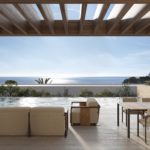 Outside, a wooden pergola shades the outdoor living and dining area, surrounded by lush gardens, terraces, and a 59.40 m² infinity pool that visually blends with the sea.