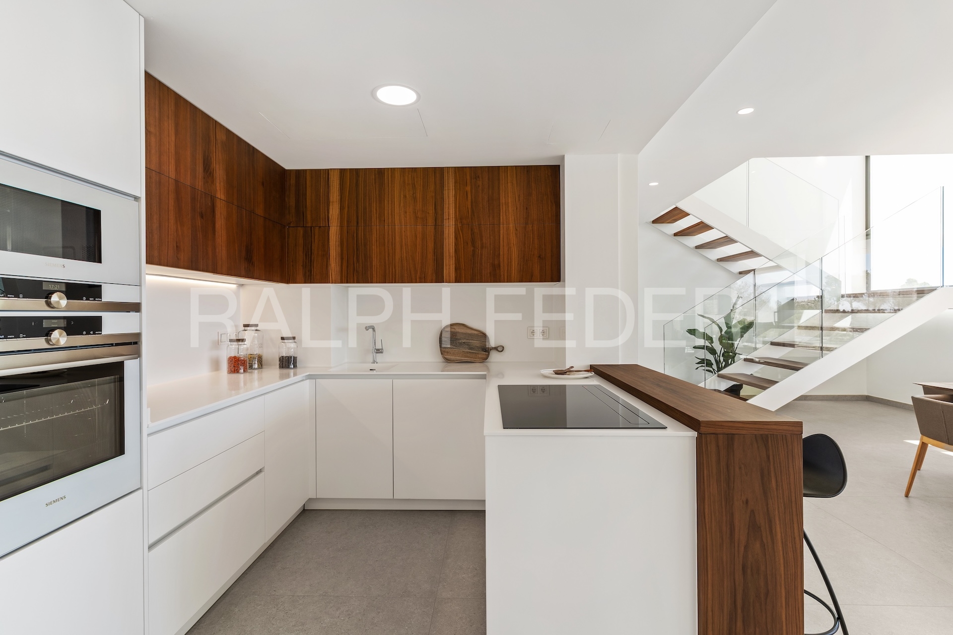 The main floor is an elegant fusion of open spaces, divided by a stylish hall and stairwell. One side hosts the fourth bedroom, complete with an en-suite bathroom, walk-in closet, and access to the main terrace adorned with a charming porch area. On the other side, discover a guest toilet, an open-concept kitchen integrated with a dining area and center island – an ideal spot for breakfast. The dining room seamlessly connects to a bright living room, offering a trifecta of spaces flooded with Mediterranean sunlight and harmoniously bridging the indoors with the outdoors.