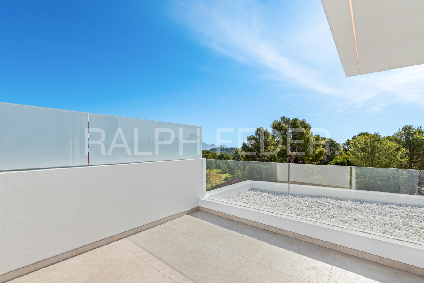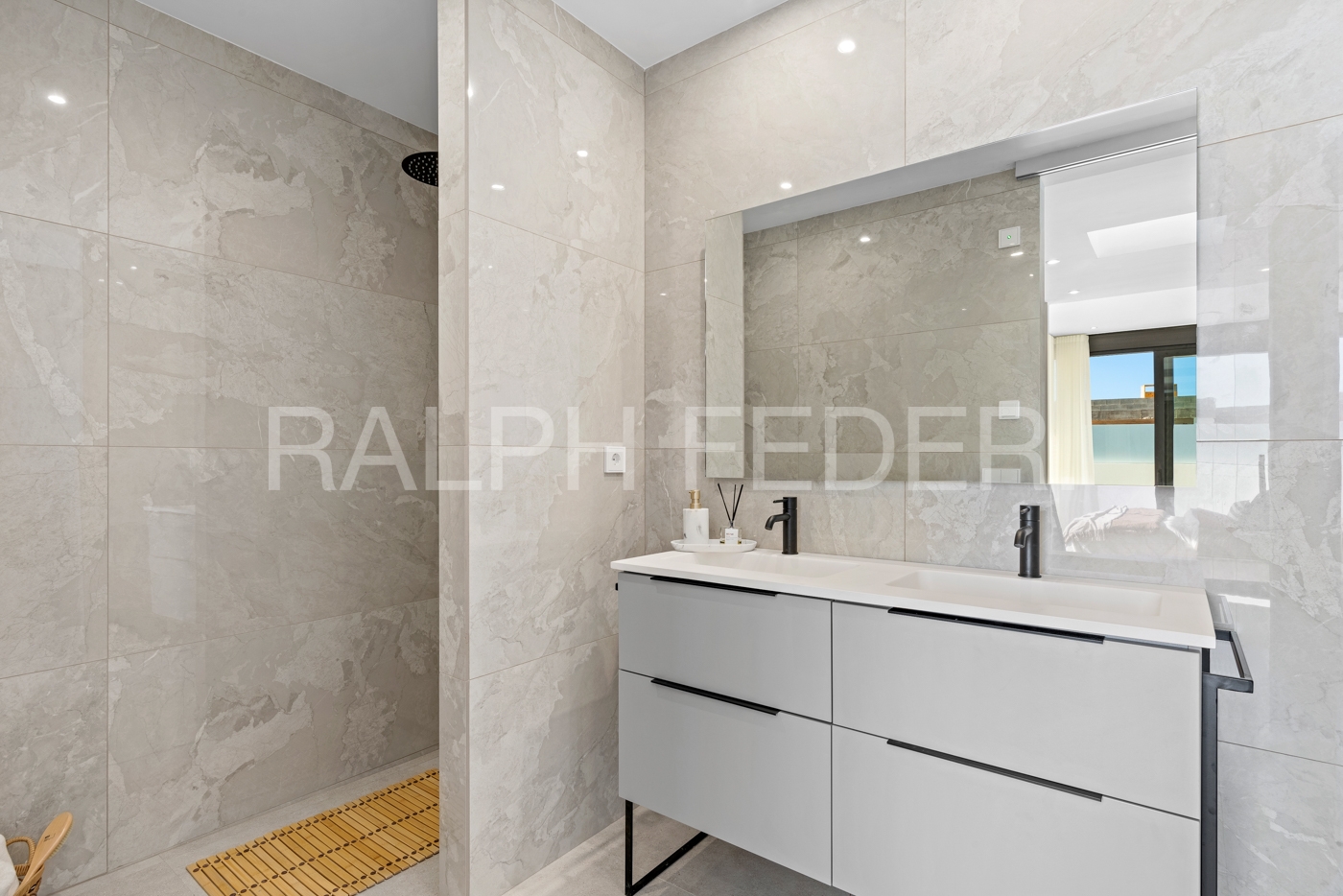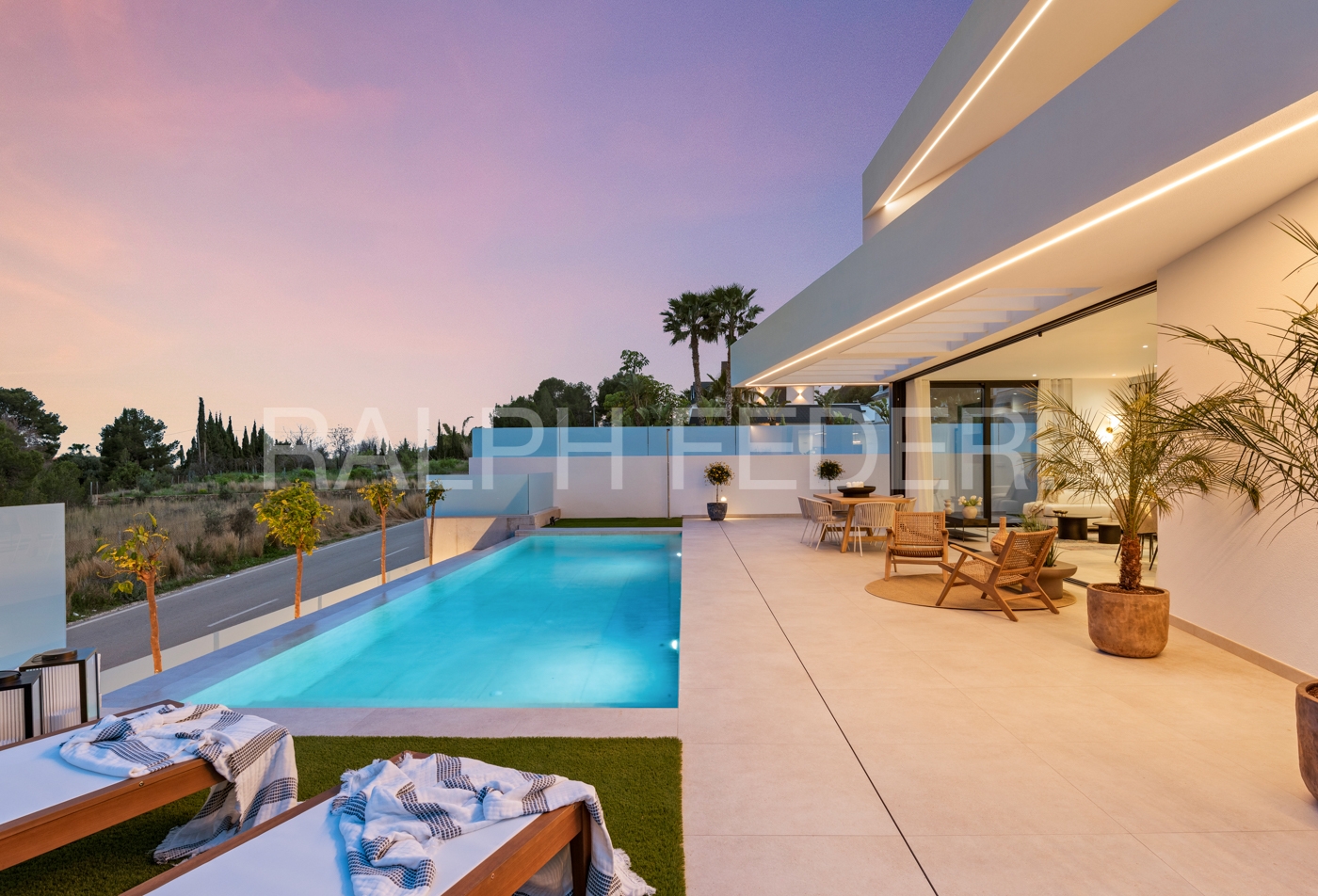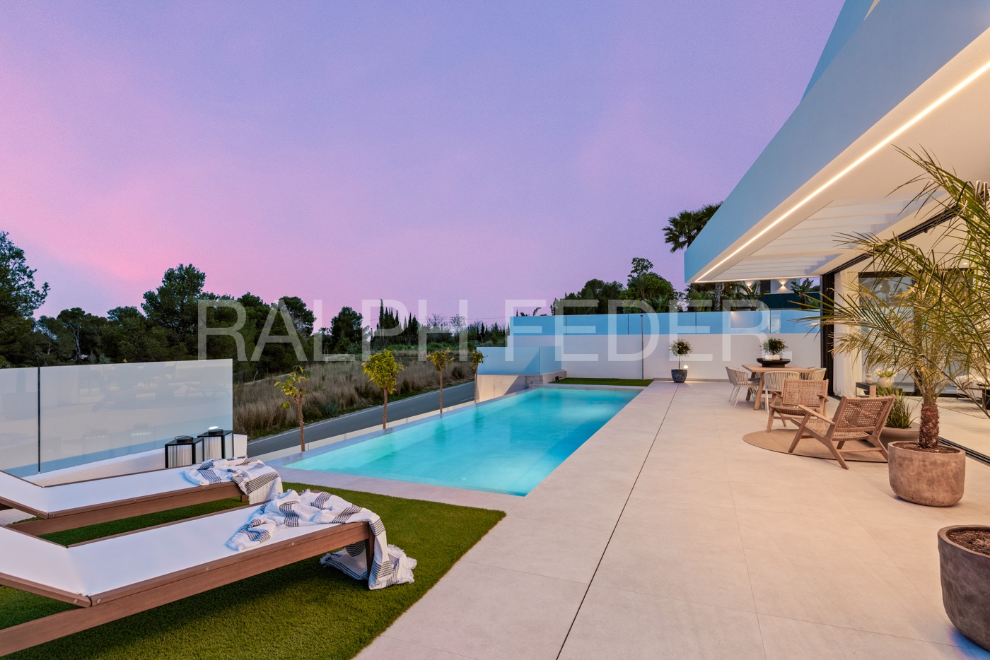 This luxury modern villa has been designed with a lot of light and open spaces, with basement, garage, infinity private pool, spacious terraces and landscaped garden to enjoy the Mediterranean climate year-round.