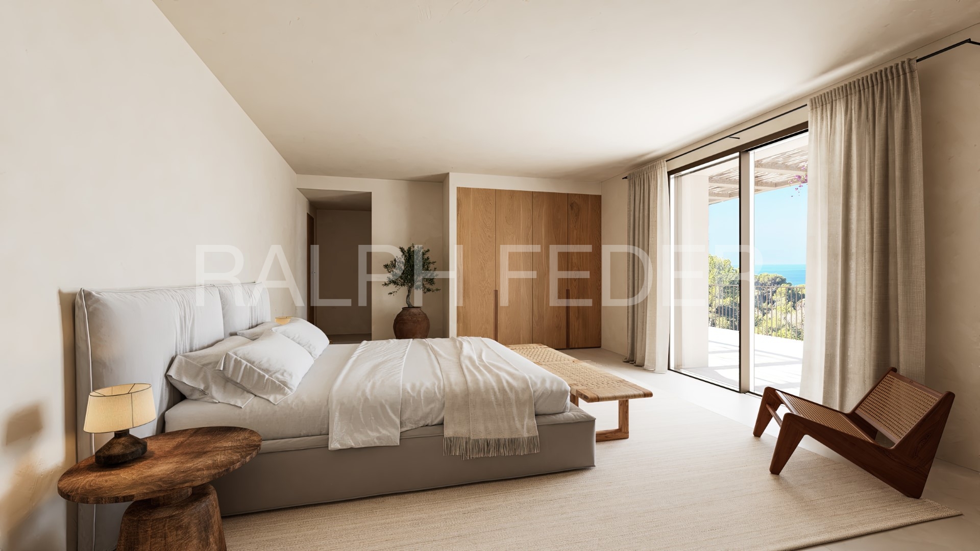 Upstairs, the main bedroom suite opens onto a private terrace with breathtaking panoramic views stretching all the way to Ibiza.