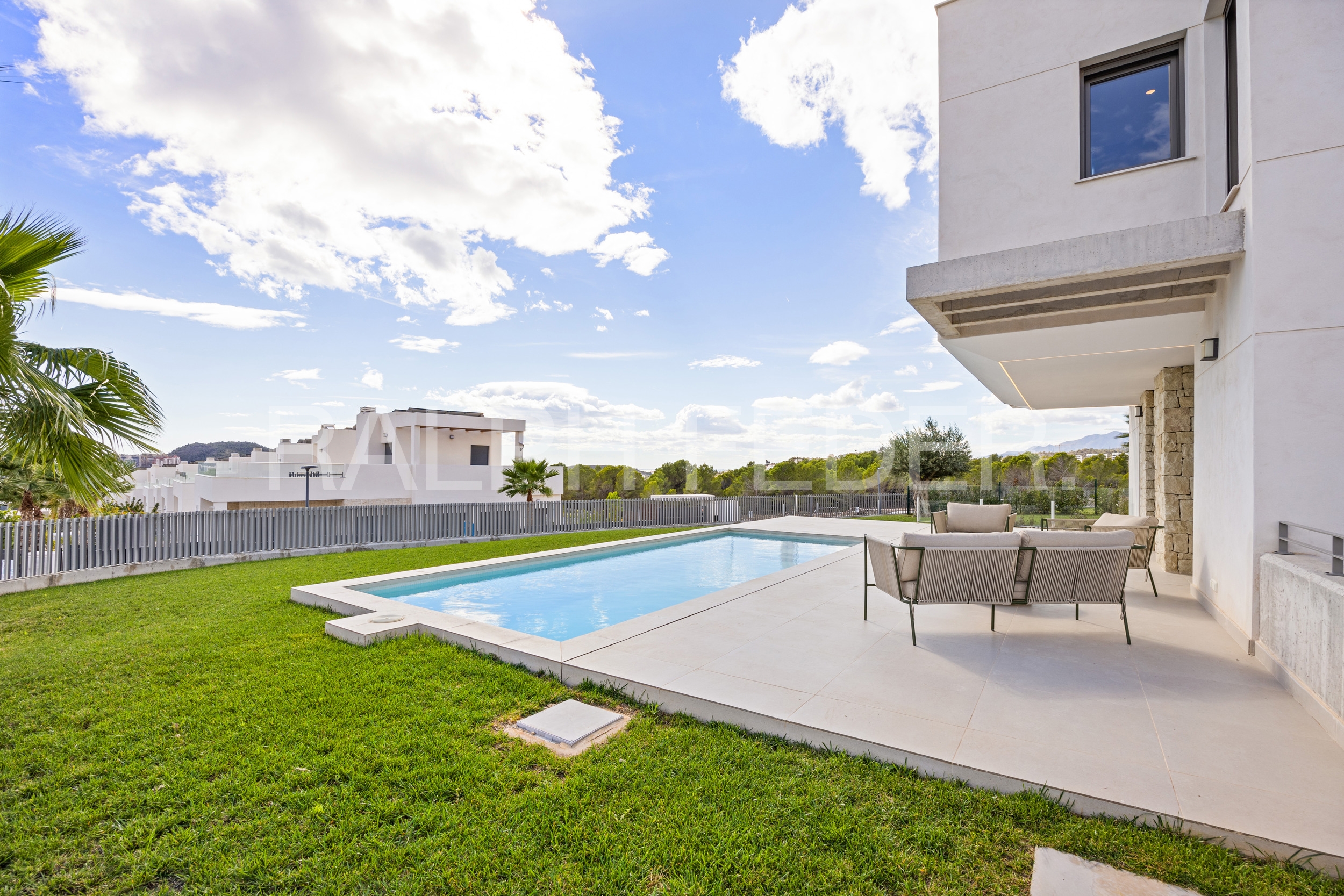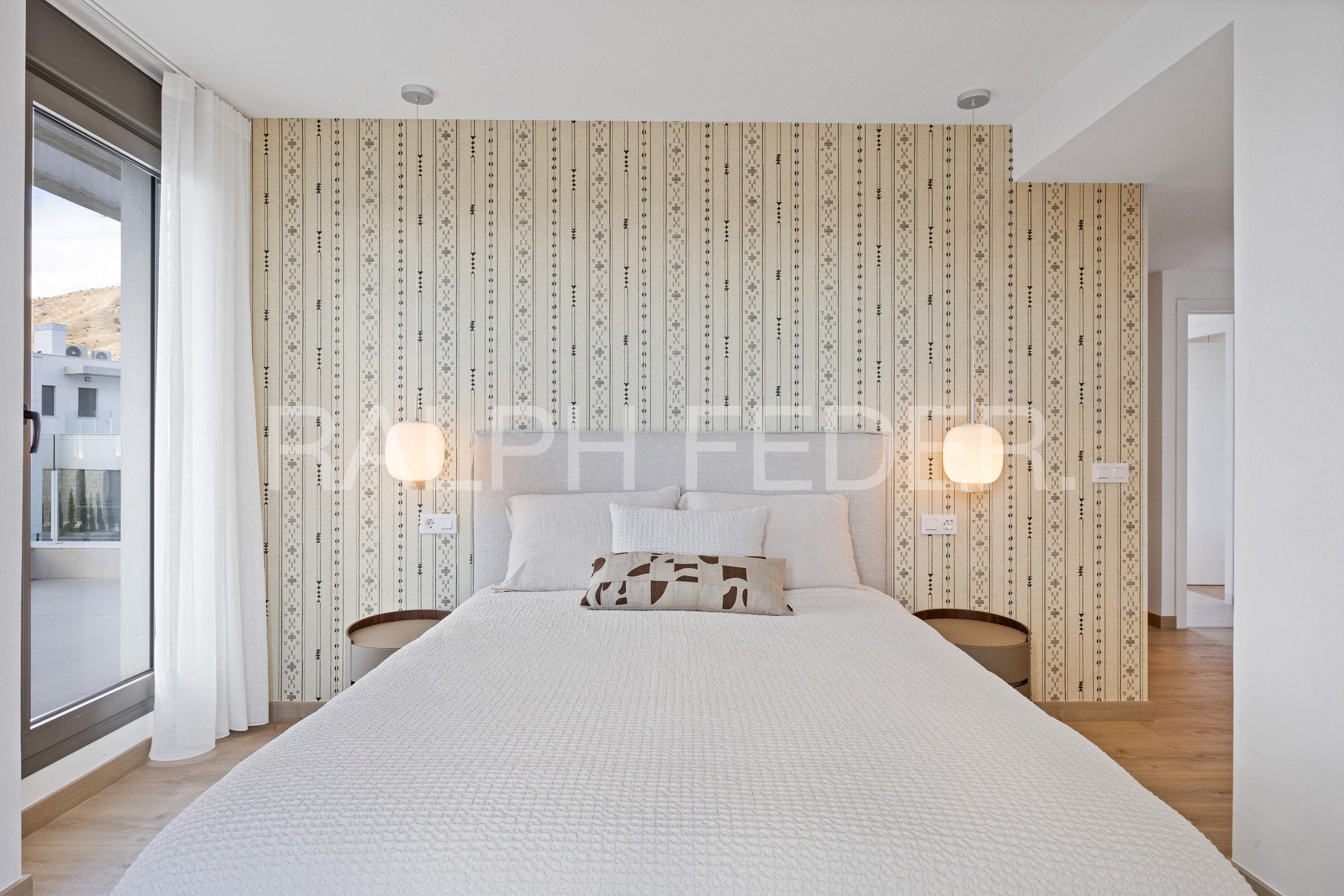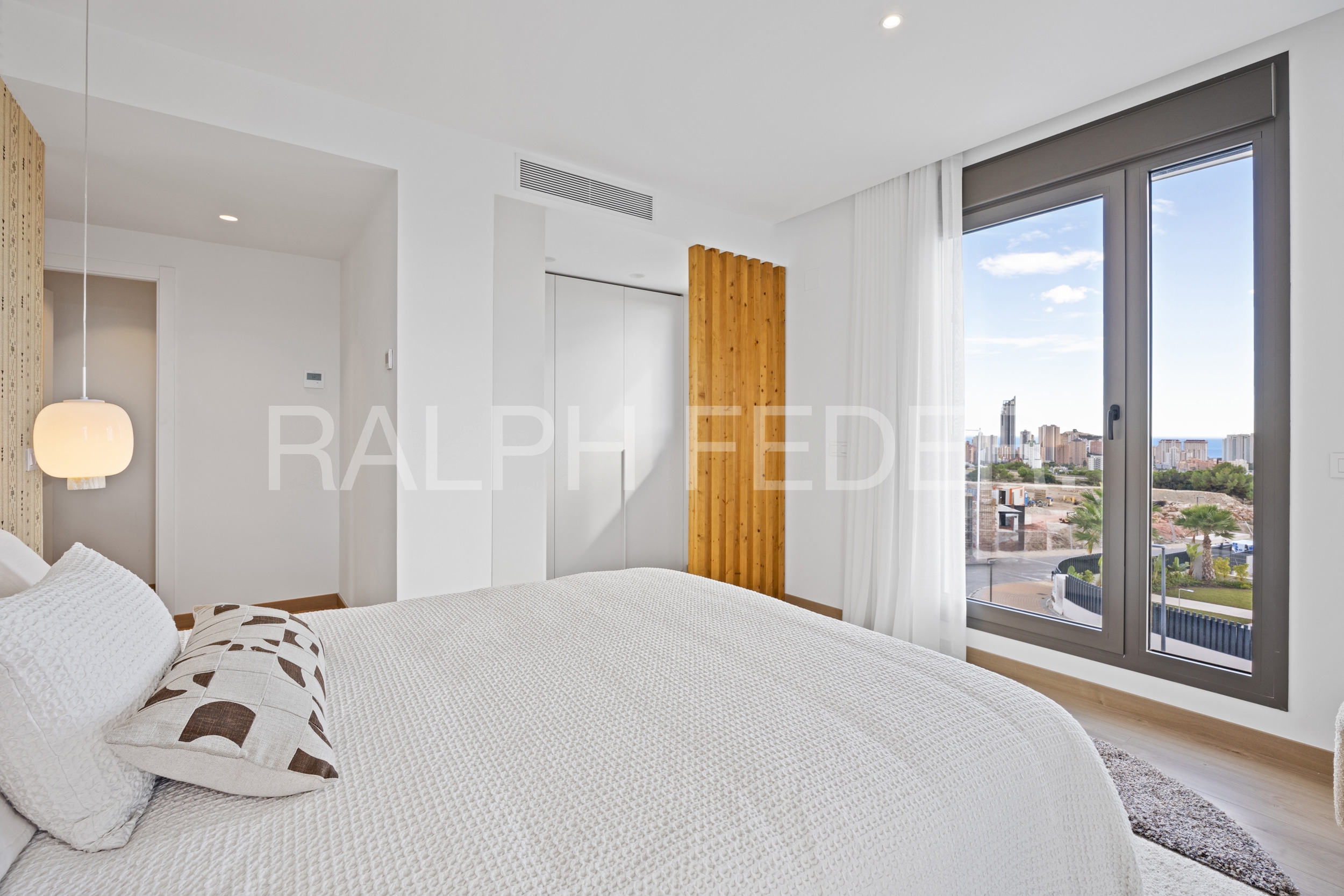 Each south-facing villa enjoys abundant natural light and open views of Benidorm, the Mediterranean Sea, and the surrounding mountains, set within the lush greenery of Sierra Cortina.
