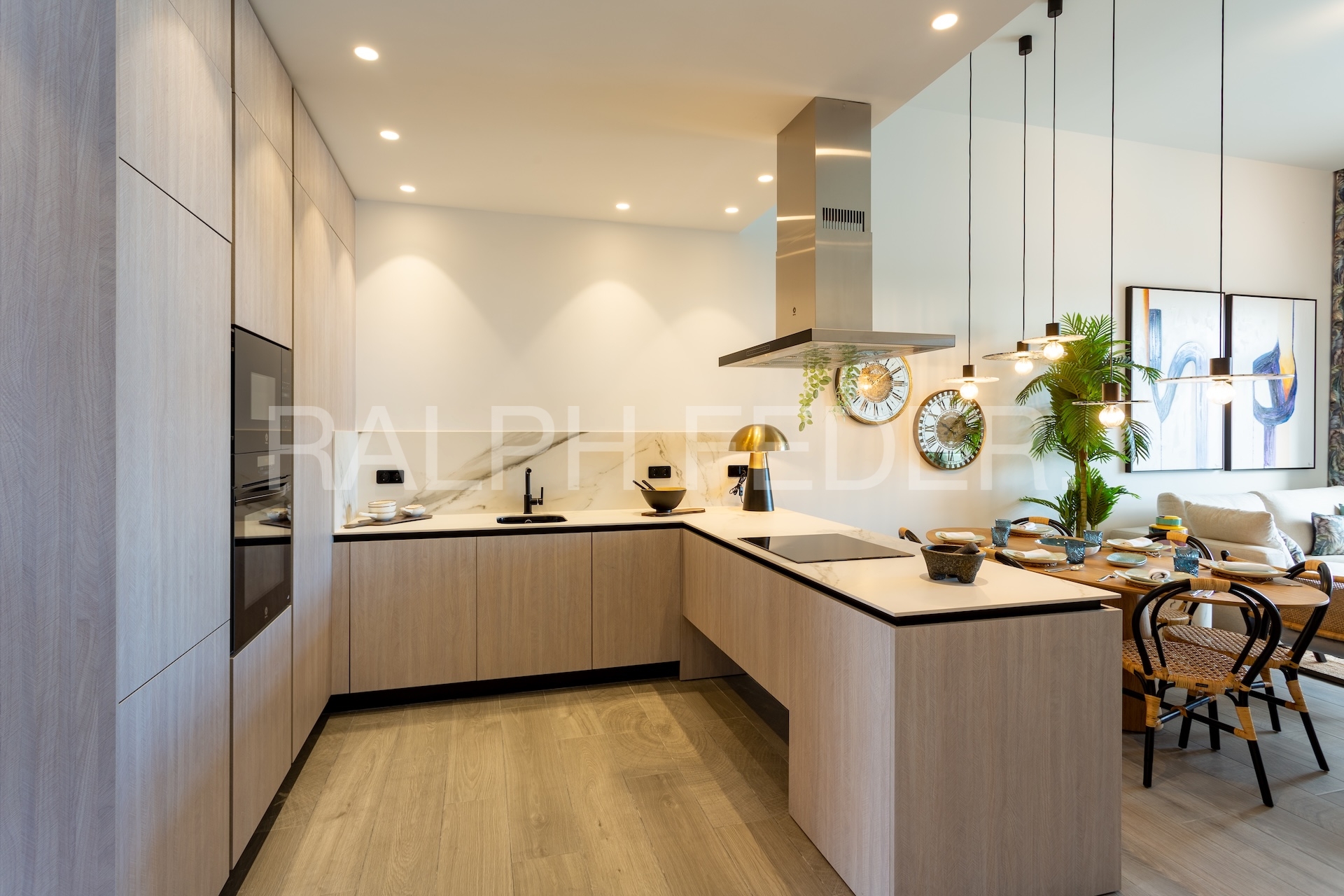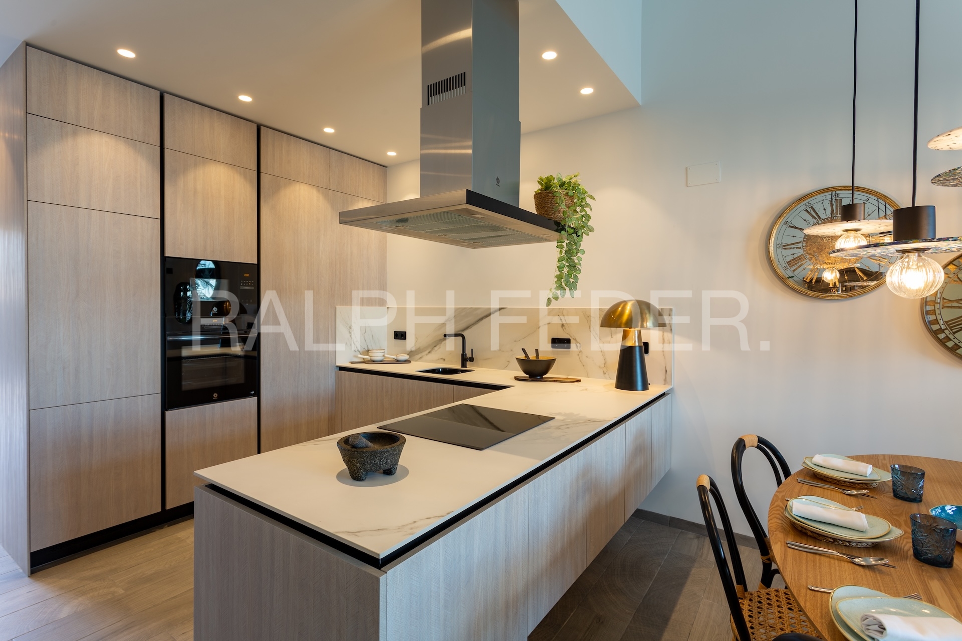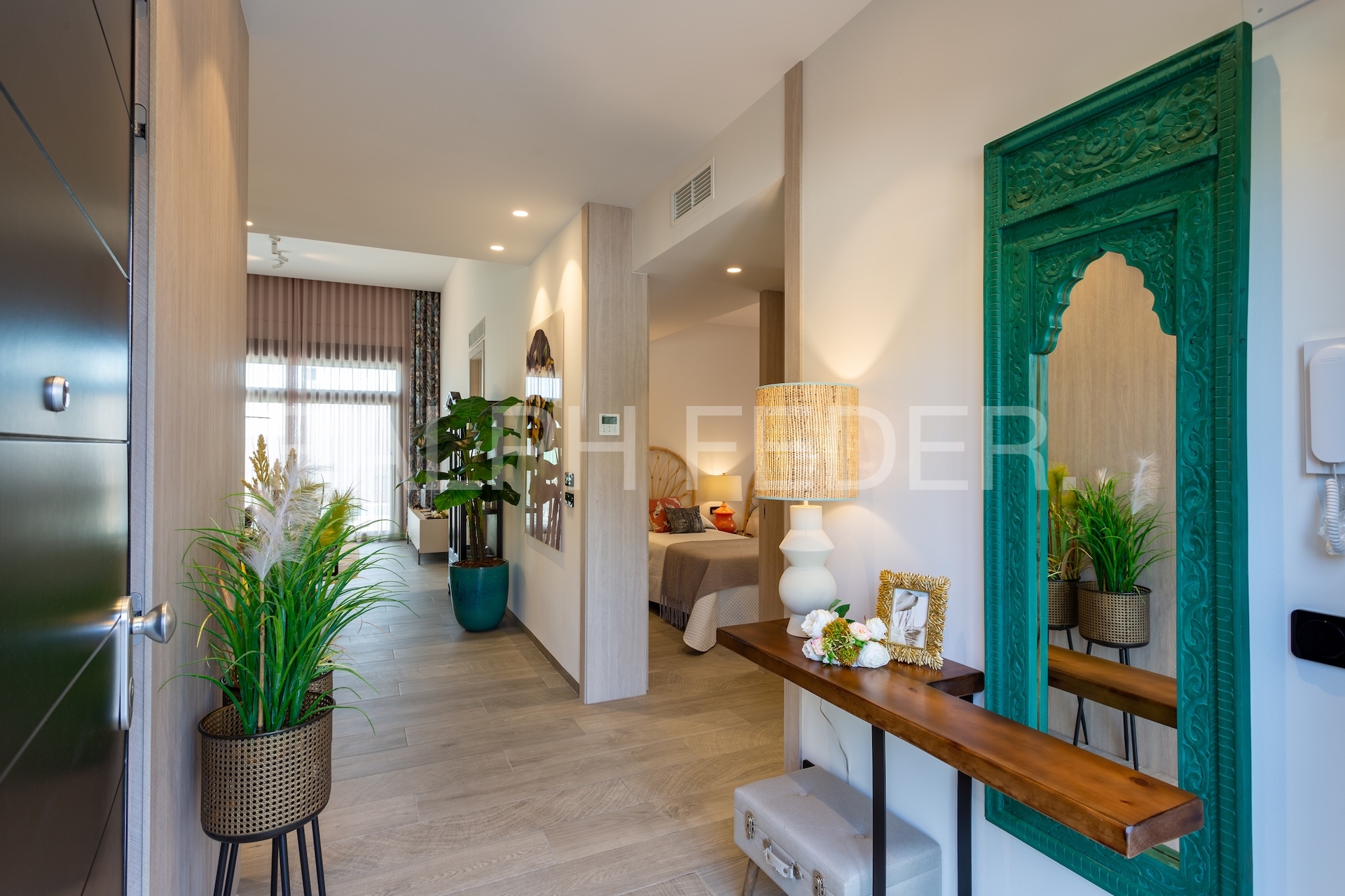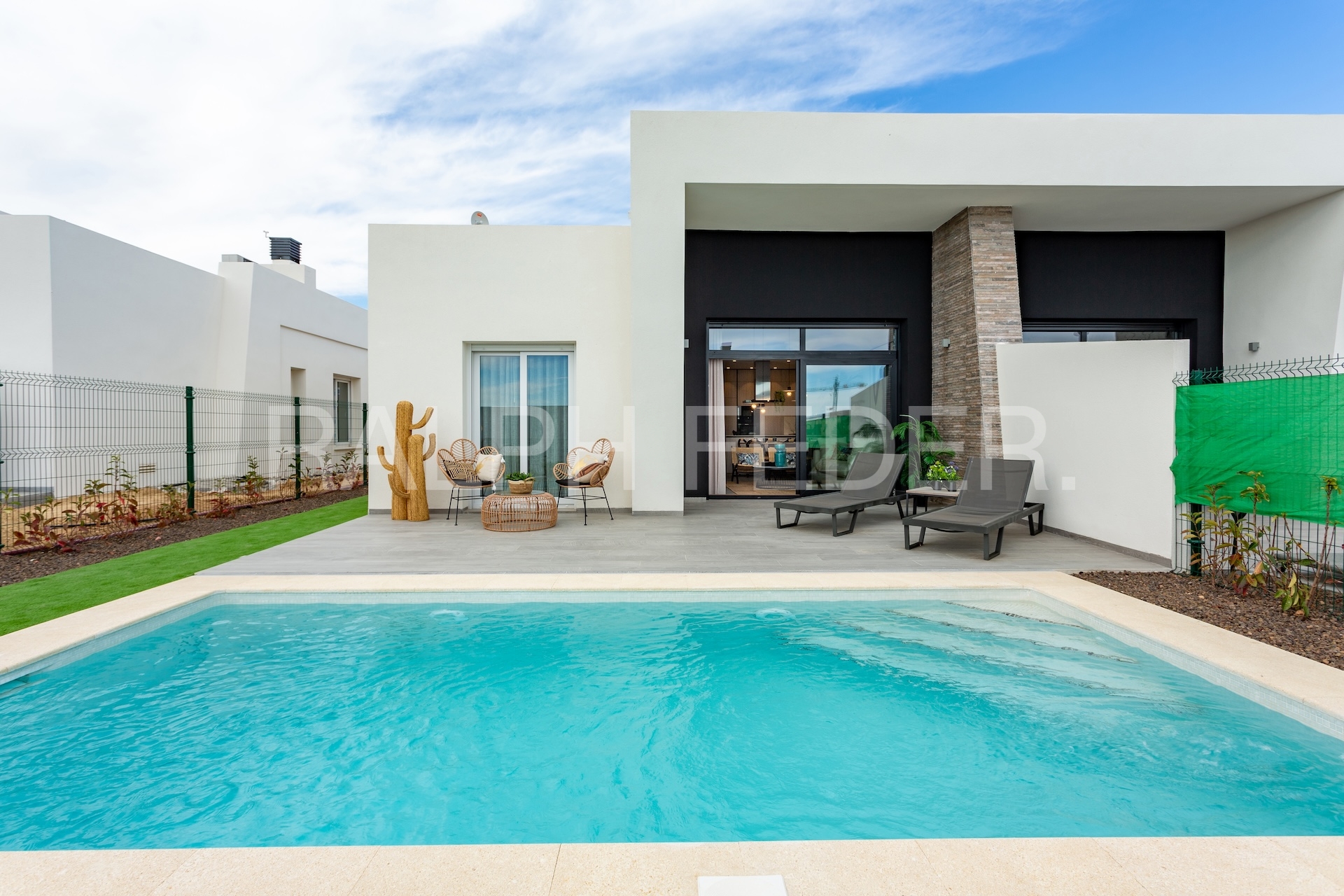 These modern 3 bedrooms houses are distributed on a single floor with 2 bathrooms, kitchen with breakfast bar and living room with access to the outdoor area with private pool, parking and private garden.