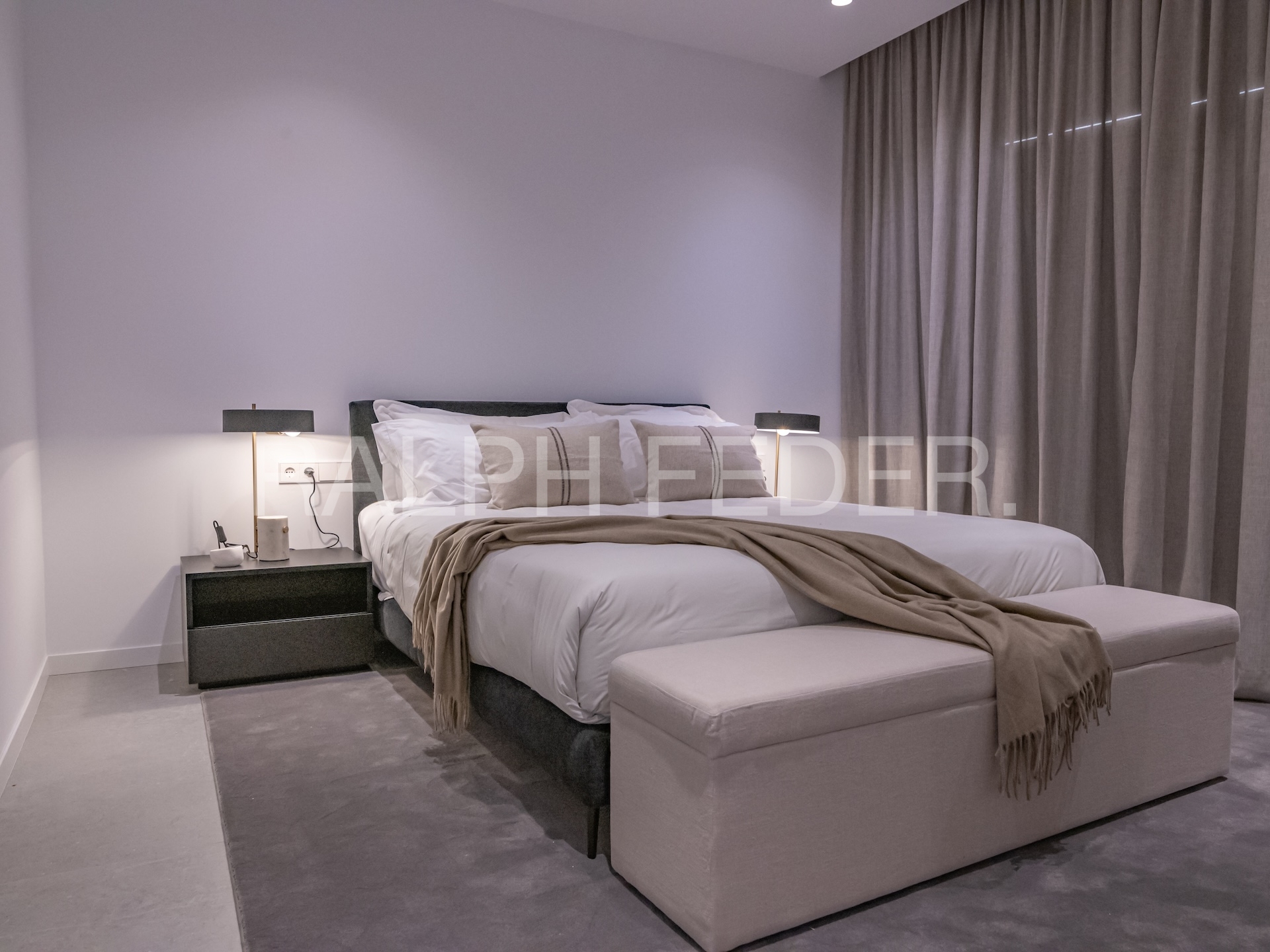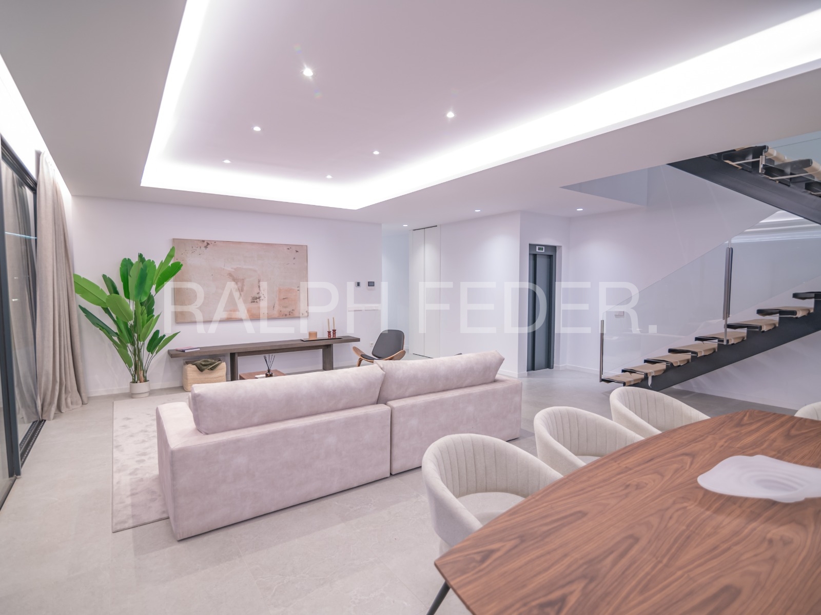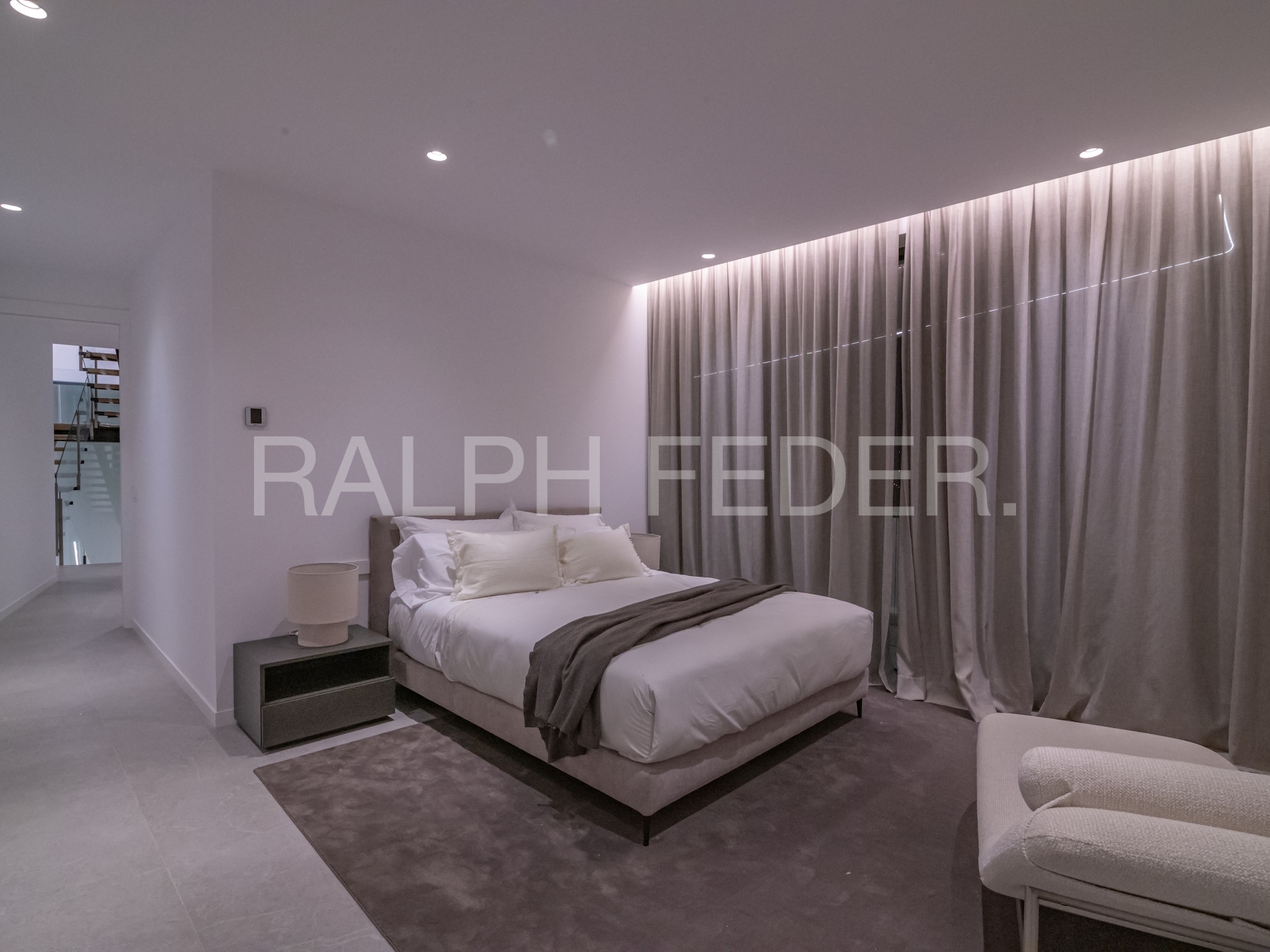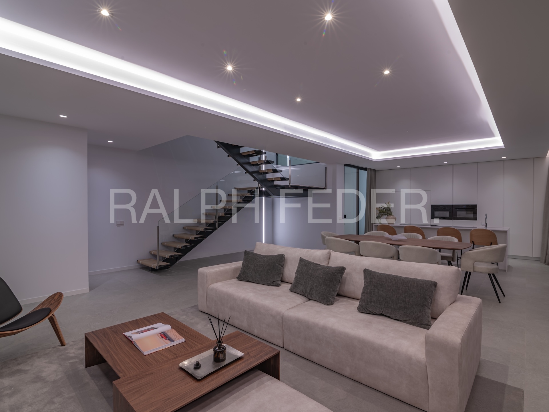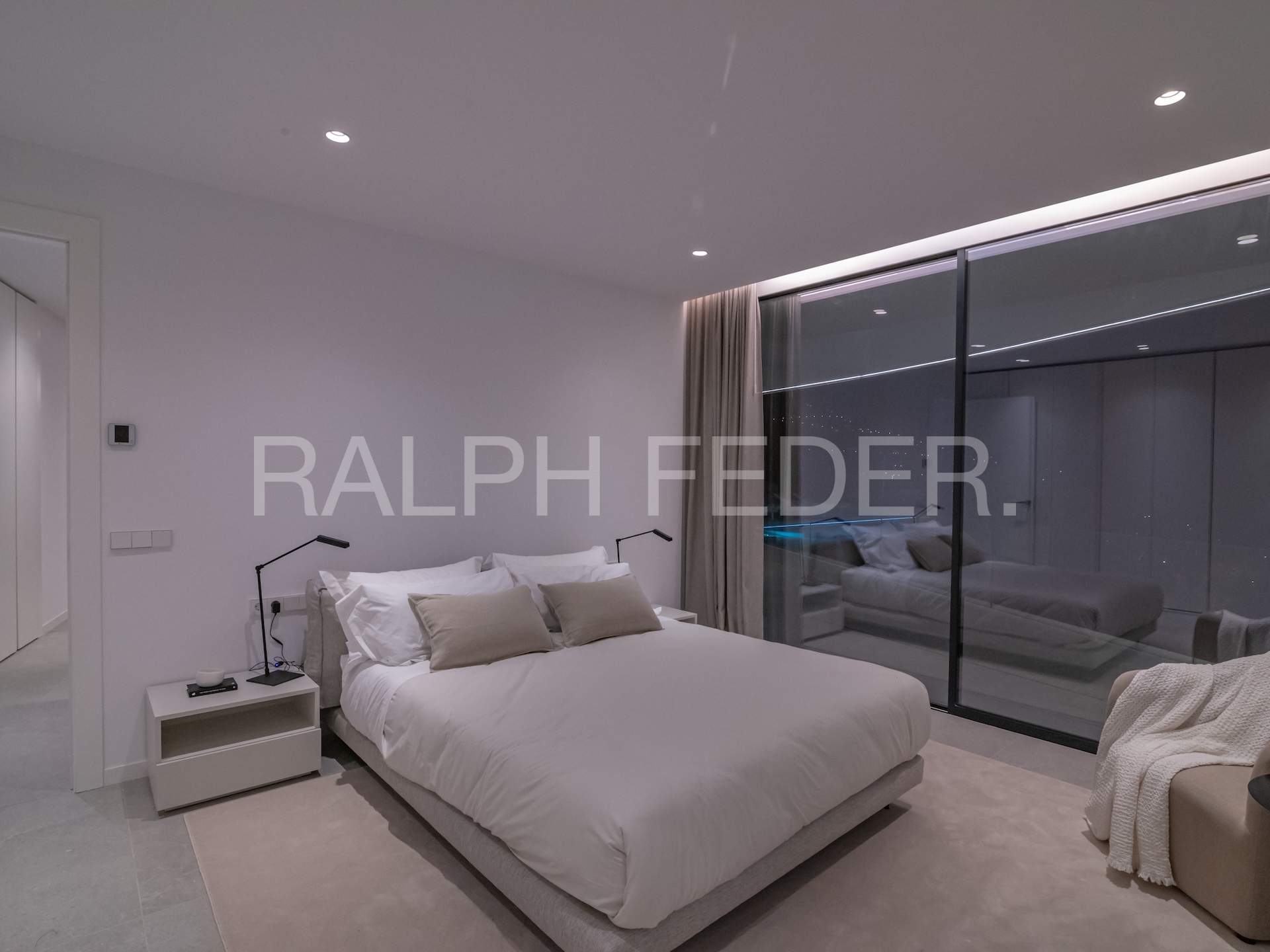 On the lower floor we find the public spaces living-dining room and the kitchen with open sea views and the exit on a terrace and huge infinity pool.