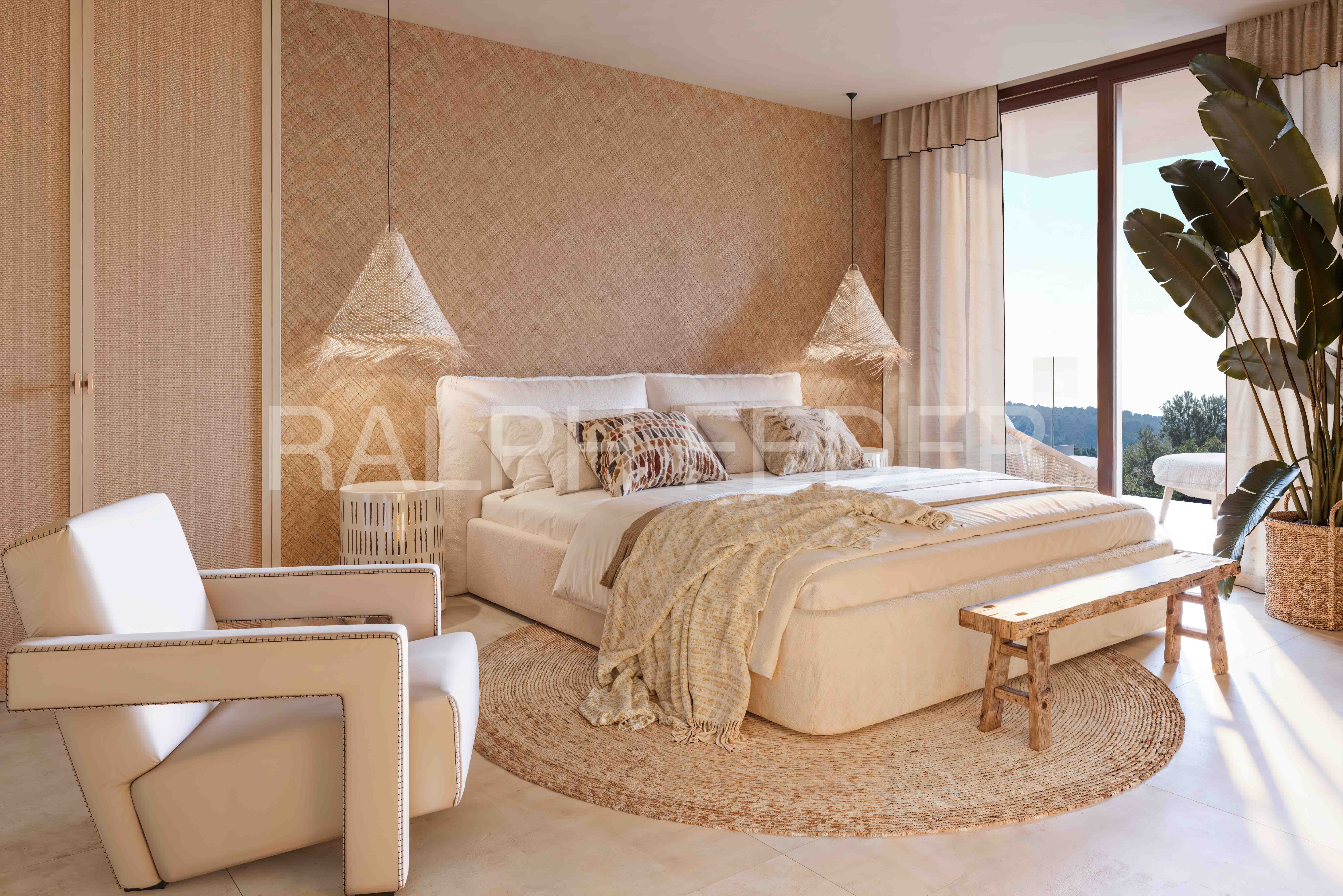 The main floor houses the master bedroom with an en-suite bathroom and dressing room, a guest toilet, and a kitchen that blends into the living room and opens onto a large terrace with views of the landscape.